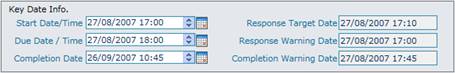 The dates within the info box will change dependant on the priority selected on the work order. If the priority has got response target, response threshold or completion threshold values set against it then the response and completion target and threshold values will be displayed. These are detailed below. (Response and Completion Targets and Thresholds)