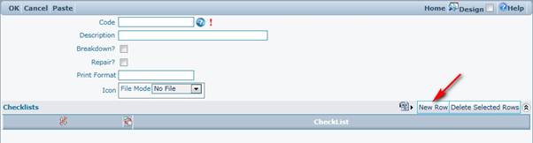 Checklists can be added when creating a new work order type or added to existing work order types using the change function. To add a checklist, click the ‘New Row’ button on the checklist grid on the detail form of the work order type.